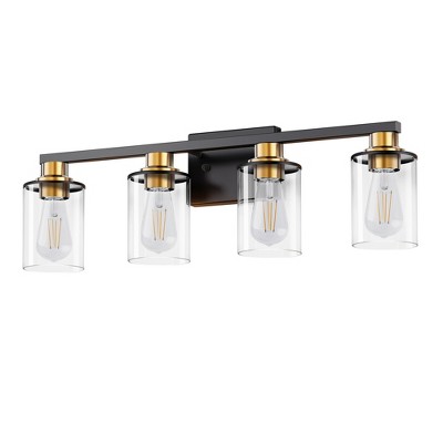 YANSUN 28 in. 4-Light Black and Gold Bathroom Vanity Light with Clear Glass Shades for Over Mirror
