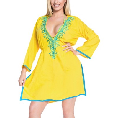 LA LEELA women's Vacation Casual Swim Holiday Beachwear Summer Short Party Swimsuit Cover ups Beach Dress Medium-Large Yellow, Solid