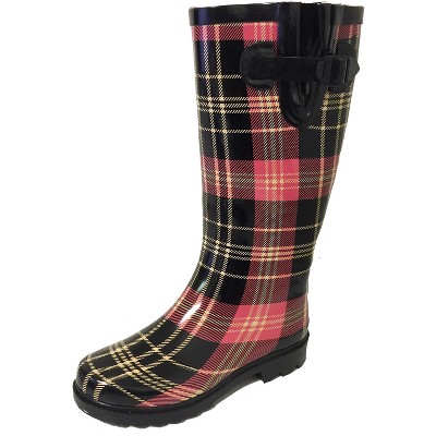 Women's Rain Boots Black/Red Plaid Rubber Mid Calf Snow Rainboot