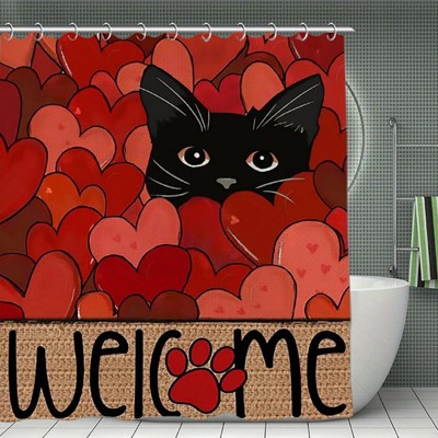 Valentine's Day Black Cat Paw Print Heart Welcome Shower Curtain - Privacy Protection 70.8x70.8Inch