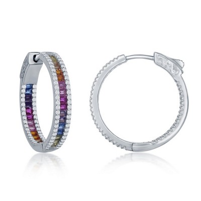 Bella Silver Sterling Silver 4x25mm Center Rainbow Channel-Set and White CZ Border Hoop Earrings - Silver