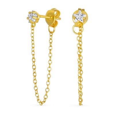 Bling Jewelry Minimalist 4MM Star CZ Stud Earrings with Delicate Chain in 14K Gold or Silver