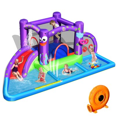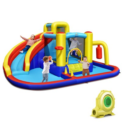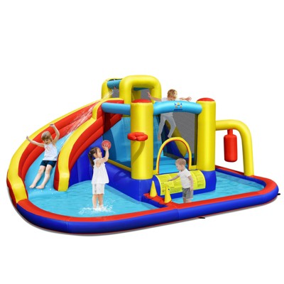 Costway Inflatable Water Park with Climbing Wall Splash Pool Water Cannons Blower