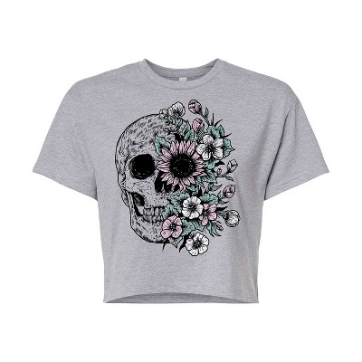 Women's - Instant Message - Half Skull Half Flowers Cropped Graphic T-Shirt