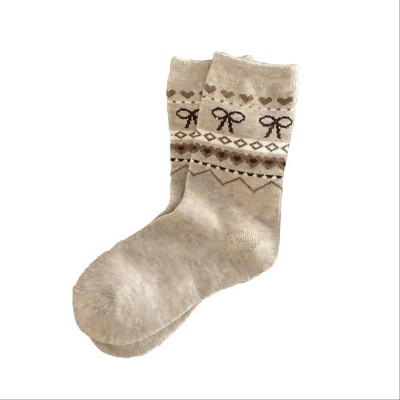 Anna-Kaci Women's 3-Pair Ribbed Knit Crew Socks with Bow and Nordic Pattern Detail - Khaki