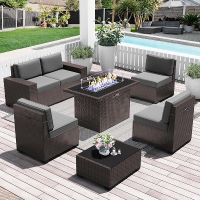 LayinSun 7 Pieces Outdoor Patio Furniture Set with 44" Fire Pit Table Brown Rattan Sectional Sofa Conversation Sets