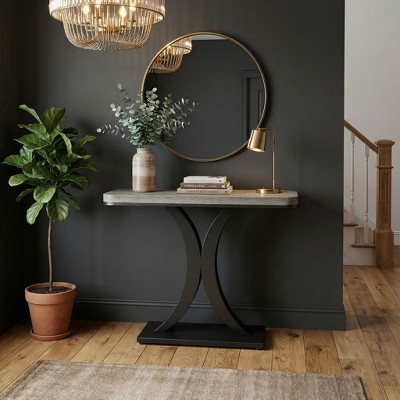 JVNOXK Modern Industrial Compact End Table with Curved Wood Top & Geometric Metal Base