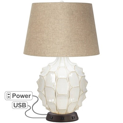 Possini Euro Design Mid Century Modern Table Lamp with USB Outlet Workstation Base 26.5" High Textured White Ceramic Drum Shade Living Room