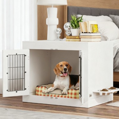 32 inch Heavy Duty Dog Crate Furniture Rustic Wooden Dog Cage Kennel Indoor Furniture with 2 Rotating Dog Bowls for Small,Medium Dogs
