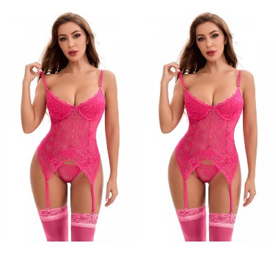 INSPIRE CHIC Women's 2Pcs Lace Mesh Push-Up Corset and Adjustable Thigh Straps Garter Belt Lingerie Sets 2 Packs