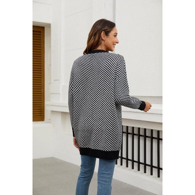 Imily Bela Womens Button Up Striped Cardigan Oversized V Neck Puff Sleeve Color Block Knit Coat