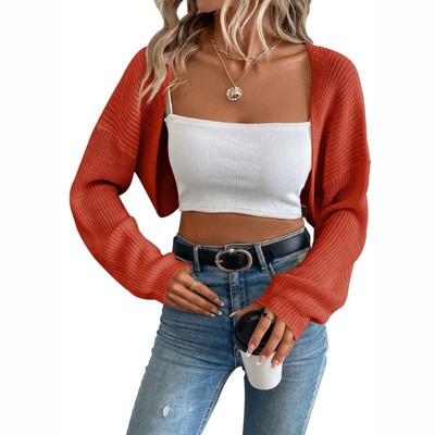 Coolmee Women's Crochet Cropped Cardigans Y5k Knit Shrug Sweater Hollow Out Long Sleeve See Through Summer Beach Bikini Cover Ups XL Rose Red