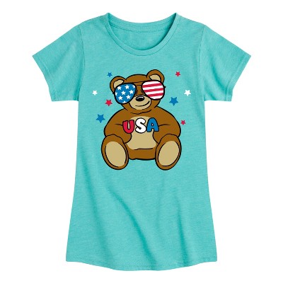 Girls' - Instant Message - Teddy Bear USA Red White Blue Sunglasses Fitted Short Sleeve Graphic T-Shirt
