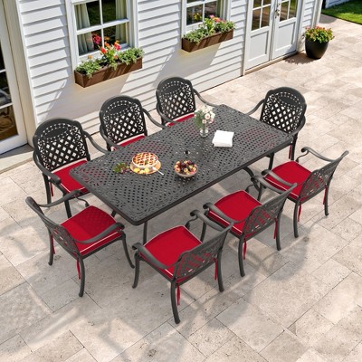 9-Piece Cast Aluminum Outdoor Dining Set with Red Cushions, Rectangle Table & Stackable Chairs - for Patio, Backyard