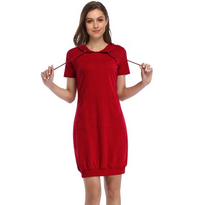 Women's Casual Short Sleeve Solid Color Pullover Hooded Tunic Dress with Kangaroo Pocket