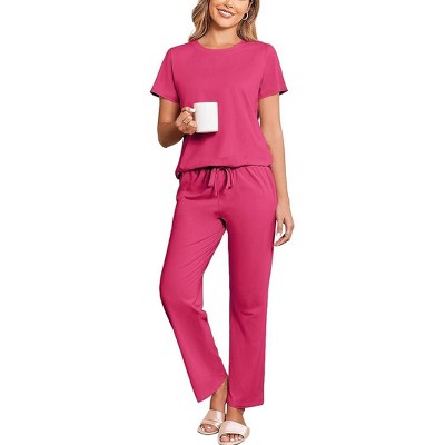 Ekouaer Women's 2 Piece Lounge Sets Short Sleeve Pajama Set Ribbed Knit Crop Top Wide Leg Pants Loungewear