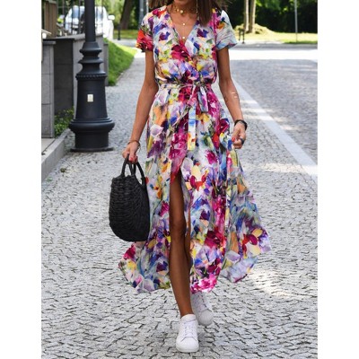Women's Elegant Floral Print Side Split A-Line Dress V-Neck Maxi Dress Casual Short Sleeve Outfits Summer Party Dresses