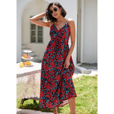 Coolmee Women's Boho Floral Dress Suspender V Neck Closed Waist Loose Maxi Dress Red Flower S