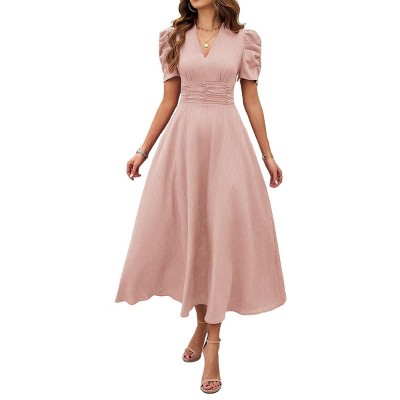 BLUEMING Womens Casual Maxi Dresses Puff Sleeve V Neck Flowy Vacation High Waist Boho Pleated Dresses