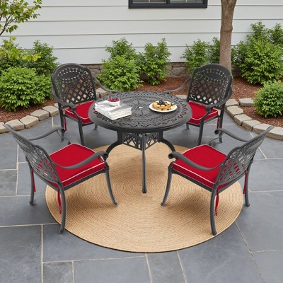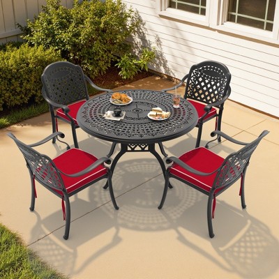 5-Piece Cast Aluminum Outdoor Dining Set: Round Table, Stackable Chairs & Red Cushions - All-Weather Patio Furniture for Your Backyard