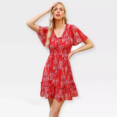 Womens Dress Floral V Neck A Line Dress with Batswing Sleeve Flutter Hem Ruffled Trim Deco Empire Waist Shirred Flowy Sundress Beach Dress