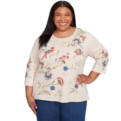 Alfred Dunner Womens Plus-Size Allover Floral Embroidered Crew Neck Top, Oatmeal, Size 3X