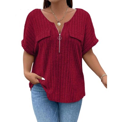 Tops for Women V Neck Zipper Fake Pocket T-Shirts Oversized Ladies Tops Ribbed Short Sleeve Tunic Top