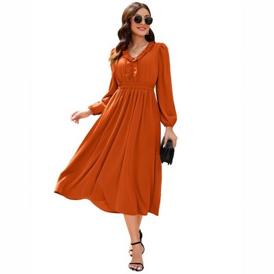 A-Line Dress for Women Fall 2025 Flounce V Neck Pleated Dress Lantern Sleeve Formal Dresses Church Dress
