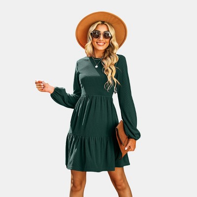 Women's Red/Green Festive Ribbed Tiered Babydoll Long Balloon Sleeves Dress - Cupshe