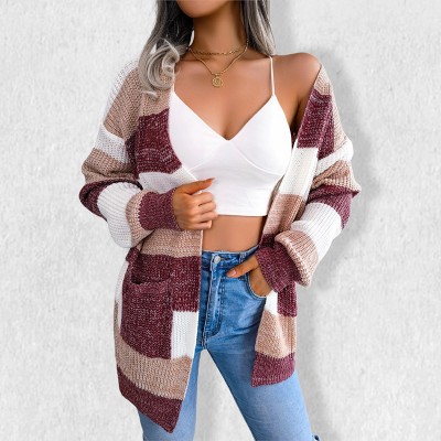 Women's Striped Lantern Sleeve Cardigan Color Block Open Front Sweater Relaxed Casual Knitwear