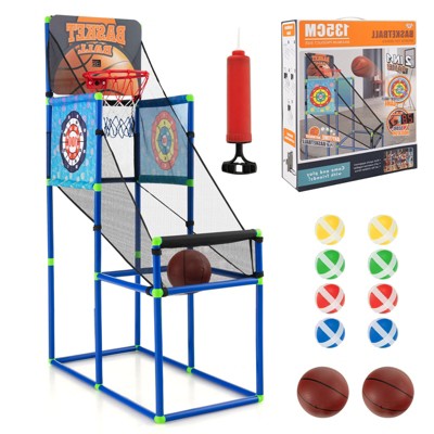 Gymax 2-in-1 Kids Basketball Arcade & Sticky Ball Game Set w/ Electronic Scoreboard & Sound Effects 2 Basketballs Ball Pump and Sticky Balls
