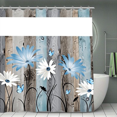 Rustic Farmhouse Shower Curtain Blue Daisy Flowers and Butterfly on Wooden Waterproof with See Through Top Bath Curtain 70.8x70.8Inch