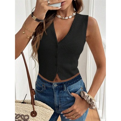 Women's Waffle Texture Sleeveless Vest Top V Neck Trendy Business Button Up Work Blazer Vests Waistcoat