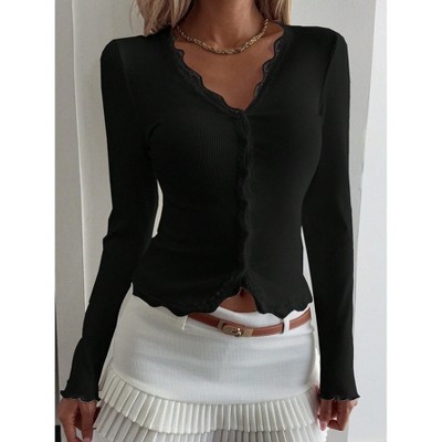 Womens Long Sleeve Lace Neck Ribbed Casual Elegant Shirts Top