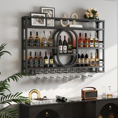 Bekrvio 39"/47" Wall Mounted Wine Rack, Metal Floating Bar Shelves with Wine Glass Holder, Industrial Liquor Shelf for Home Bar Kitchen Dining