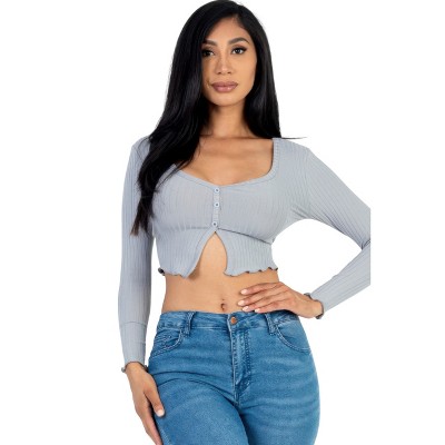Slickblue Women's Ribbed Long Sleeve Button-Front Top, Cropped Fit, Casual Stretch Style, 10 Color Options, Size S-L