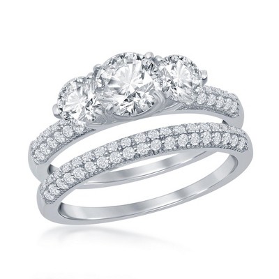 Bella Silver Sterling Silver Three-Stone Half Micro Pave Band Engagement Ring Set - Available Sizes: 9 , 8 , 7 , 6