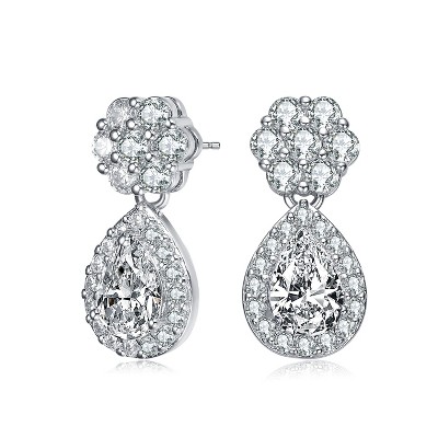 Guili Sterling Silver Rhodium Plated Clear Pear and Round Cubic Zirconia Halo with Flower Post Drop Earrings, a Delicate and Feminine Beauty