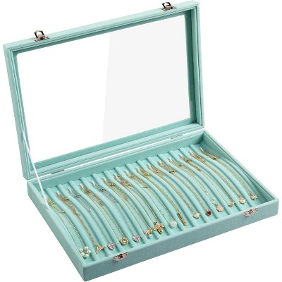 Lockable Necklace Organizer with 15 Hooks, Beige Velvet Tray and Clear Lid for Pendants and Chains, Jewelry Storage Box