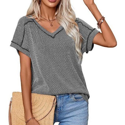 Women's Contrast Trim Color Block Puff Short Sleeve Knit Sweater Top Summer Casual Crew Neck Top Trendy Sweet Feminine Blouse