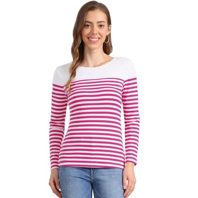 INSPIRE CHIC Women's Color Block Round Neck Long Sleeves Striped Basic T-Shirt