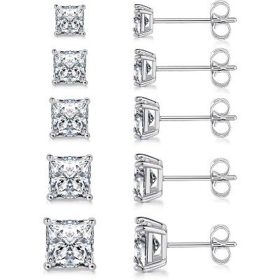 5-Pack Princess Cut CZ Stud Earrings - 18K White/Yellow/Rose Gold Plated Square Cubic Zirconia Earrings