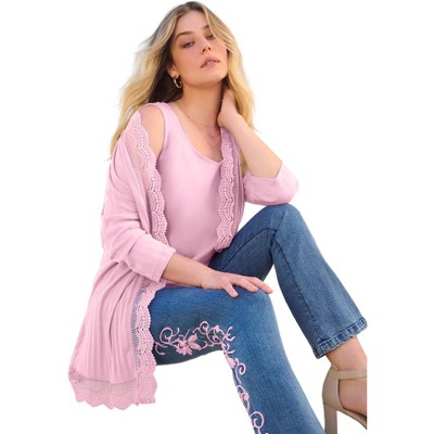 Roaman's Crochet Trim Pointelle Cardigan