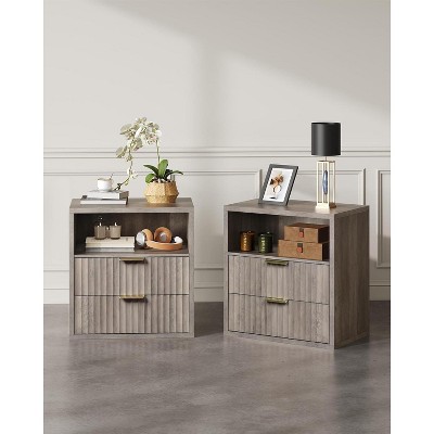 Set of 2 Mid Century Modern Fluted Nightstands, Wooden Bedside Table with Drawers & Open Shelf, Espresso