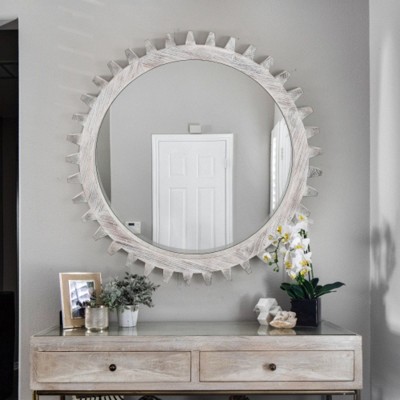 Vintage 34'' x 34'' Wood Round Hanging Gear Shape Heavy Decorative Mirror For Bathroom Living Room Entryway Or Put Together To Your Liking.