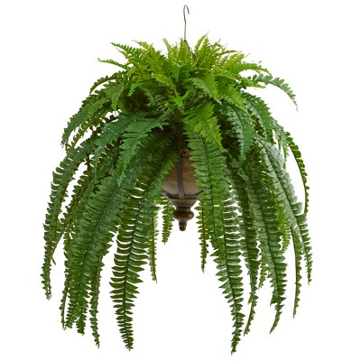 Nearly Natural 39-in Boston Fern Artificial Plant in Metal Hanging Bowl
