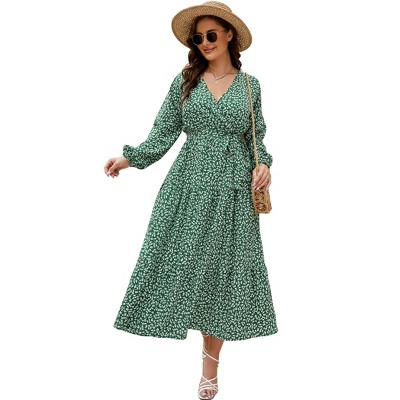 Coolmee Women's Summer Boho Dresses Casual V Neck Ruffle Sleeve Sundress Flowy Tiered Beach Vacation Maxi Dress with Belt