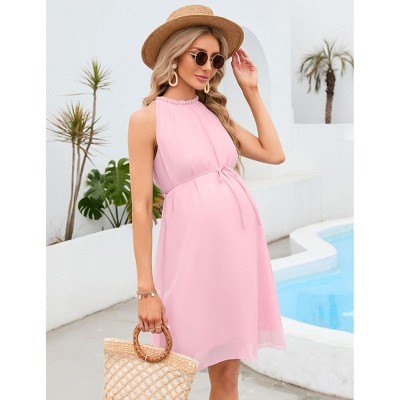 Maternity Halter Neck Dress Sleeveless Ruffle Flowy A-Line Mini Dresses