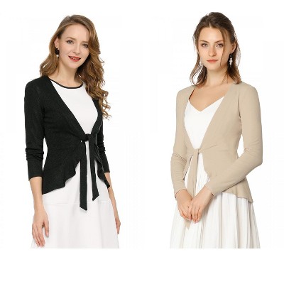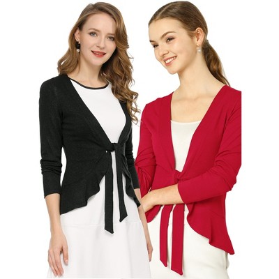 INSPIRE CHIC Women's Solid Tie Open Front Long Sleeve Knit Metallic Ruffled Crop Cardigan 2 Packs