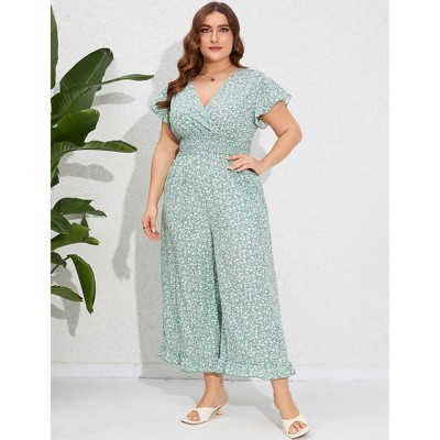 Women's Plus Size Wide Leg Floral Jumpsuits Casual Summer Short Sleeve Fashion Outfit Criss Cross Neck Smocked Waist